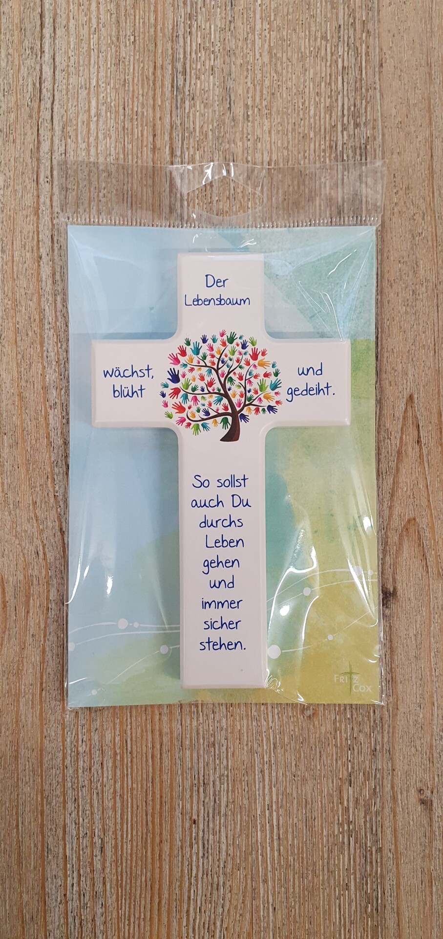 Spruch auf dem Kreuz: ‚Der Lebensbaum wächst, blüht und gedeiht. So sollst auch Du durchs Leben gehen und immer sicher stehen‘